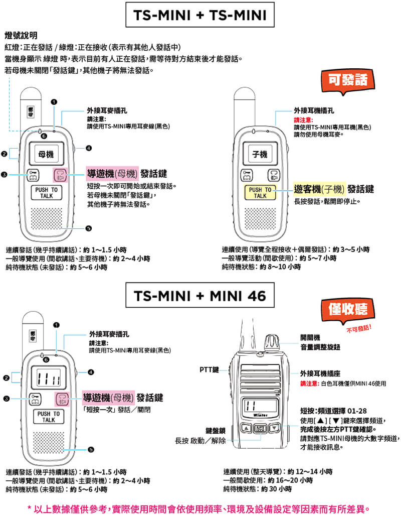 - 下單數量請填母機+子機的「總支數」,並於訂單備註母機(導遊機)的數量,出貨機型及配件以本公司庫存為主。